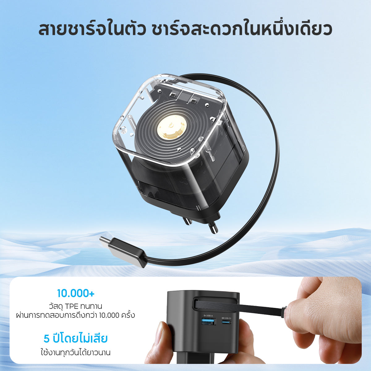 มาพร้อมกับสายเคเบิล USB-C แบบพับเก็บได้ขนาด 70 ซม. ซึ่งสามารถใช้ได้ด้วยการดึงเพียงครั้งเดียวและกดเพียงครั้งเดียว บอกลาปัญหาสายไฟพันกัน โต๊ะสะอาด และพกพาสะดวกมากเมื่อออกไปข้างนอก~